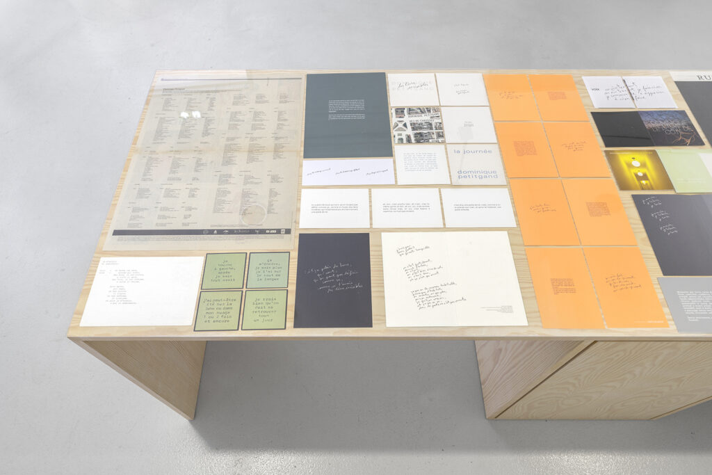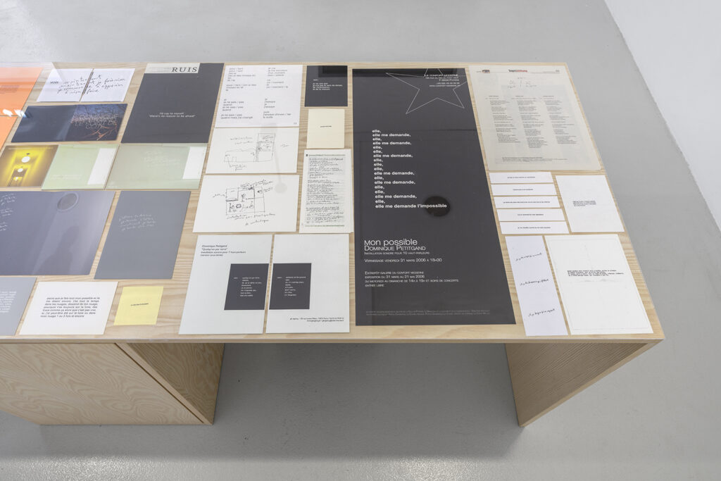Lors de certaines expositions, lorsqu’il est possible d’utiliser un espace documentaire en annexe à côté des installations, je réalise une composition à partir de ce fonds constitué au fil des années de différentes éditions papier (ephemera, cartes postales, cartons d’invitation, affiches, interventions dans les journaux, pochettes de disques, images-mots et autres éléments de communication). Composition sous vitre, arrangée et combinée selon le format, le modes d’apparition des mots, le récit, la couleur…