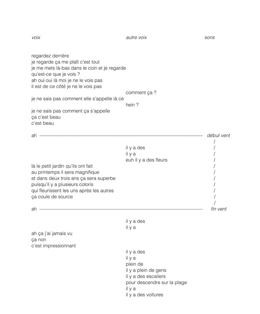 Les paroles sont découpées, hésitantes et suspendues dans le silence. Elles circulent d’un haut-parleur à l’autre, enjambant les espaces : quatre dans une grande salle principale et un dans une petite salle attenante. Les voix sont plurielles, de différentes générations et âges, et décrivent, chacune à leur tour, quelques éléments brefs et disparates d’un paysage composite et fantasmé, non situé (quelques éléments urbains, naturels ou balnéaires), creusé par les silences et les absences, indéterminé entre le passé et le présent, le réel et l’imaginaire. Certaines voix racontent, d’autres lancent le récit ou interagissent.