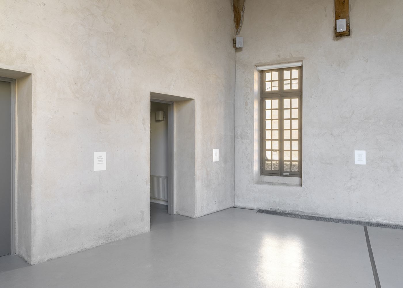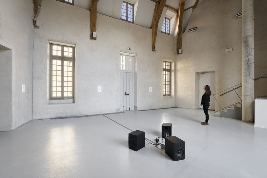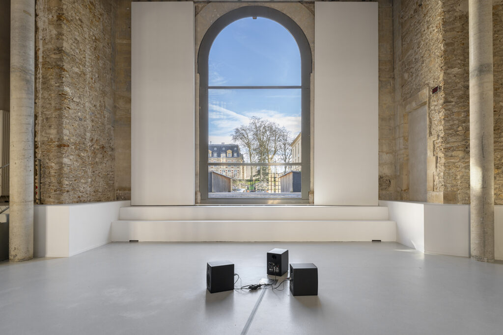 Cinq haut-parleurs blancs et légers, fixés dans la partie haute des murs, diffusent des voix — matière principale de la composition — tandis que trois haut-parleurs noirs et massifs, posés au sol dans